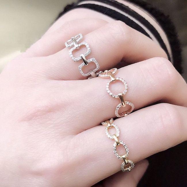 Set in 14k gold, this striking ring contrasts micropave diamonds with high polish sections and is wonderful for stacking. This ring is available in eternity and halfway styles, and can be ordered in any size - just drop us a line!