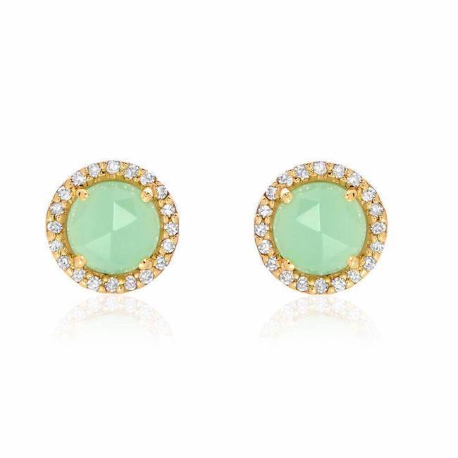 5.0mm stud earrings in 14k gold with a rose cut chrysoprase center and a halo of diamonds on each stud.