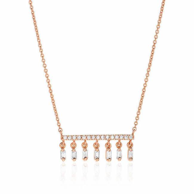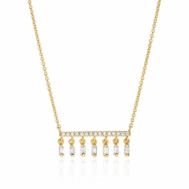 In 14k gold, this necklace features 15 hand set diamonds on a bar, trimmed with 7 dangling baguette diamonds, on an adjustable 16-18" chain. Part of our Heirloom Collection.