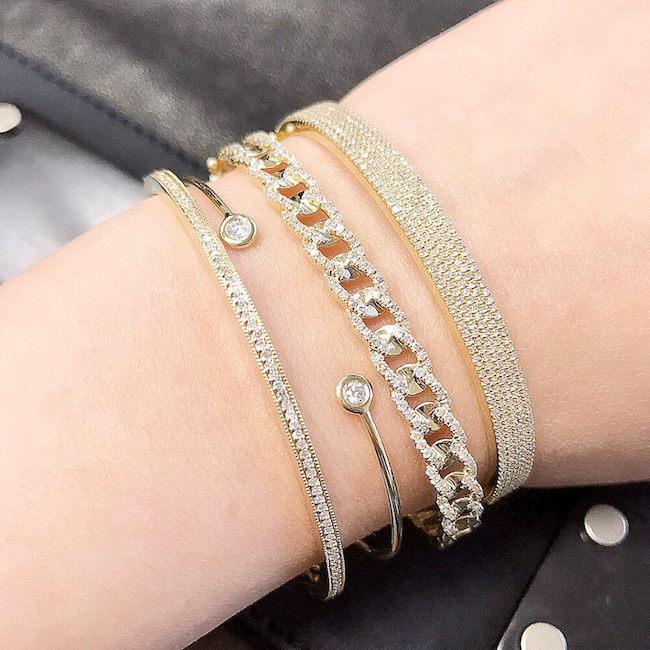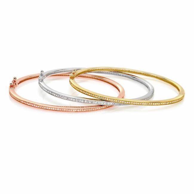 This bangle is a bestseller! Featuring diamonds set all the way around and decorated with dainty migrain, it looks beautiful when stacked with fine delicate pieces. Each bracelet sold separately.