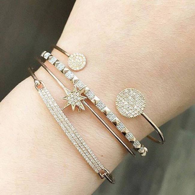 This bangle is a bestseller! Featuring diamonds set all the way around in a wonderful repeated pyramid pattern, it looks beautiful when stacked with fine delicate pieces. Each bracelet sold separately.