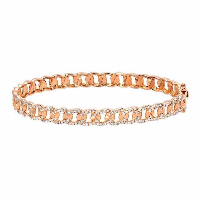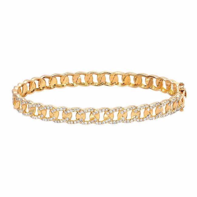 This 14k gold bangle features a classic curb chain style motif with diamonds set halfway. This substantial bangle stacks beautifully.