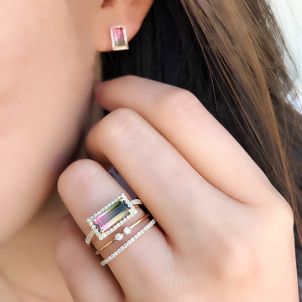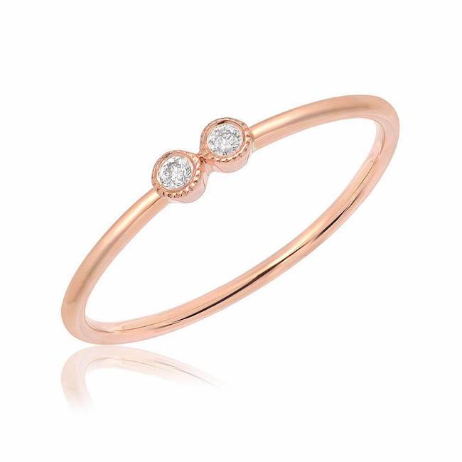 This 14k gold ring features a double petite diamond bezel center. This ring adds a cute accent to a ring stack, and looks great with a statement colored stone ring.