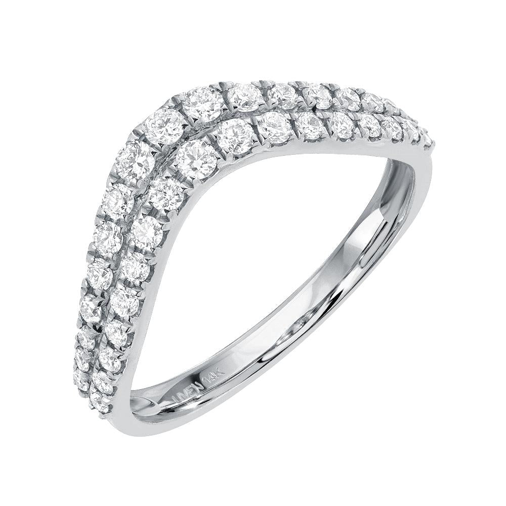 This striking ring features two rows of graduated diamonds on a gentle V, set in 14k gold. Designed especially to nestle with statement rings, it also stands alone.