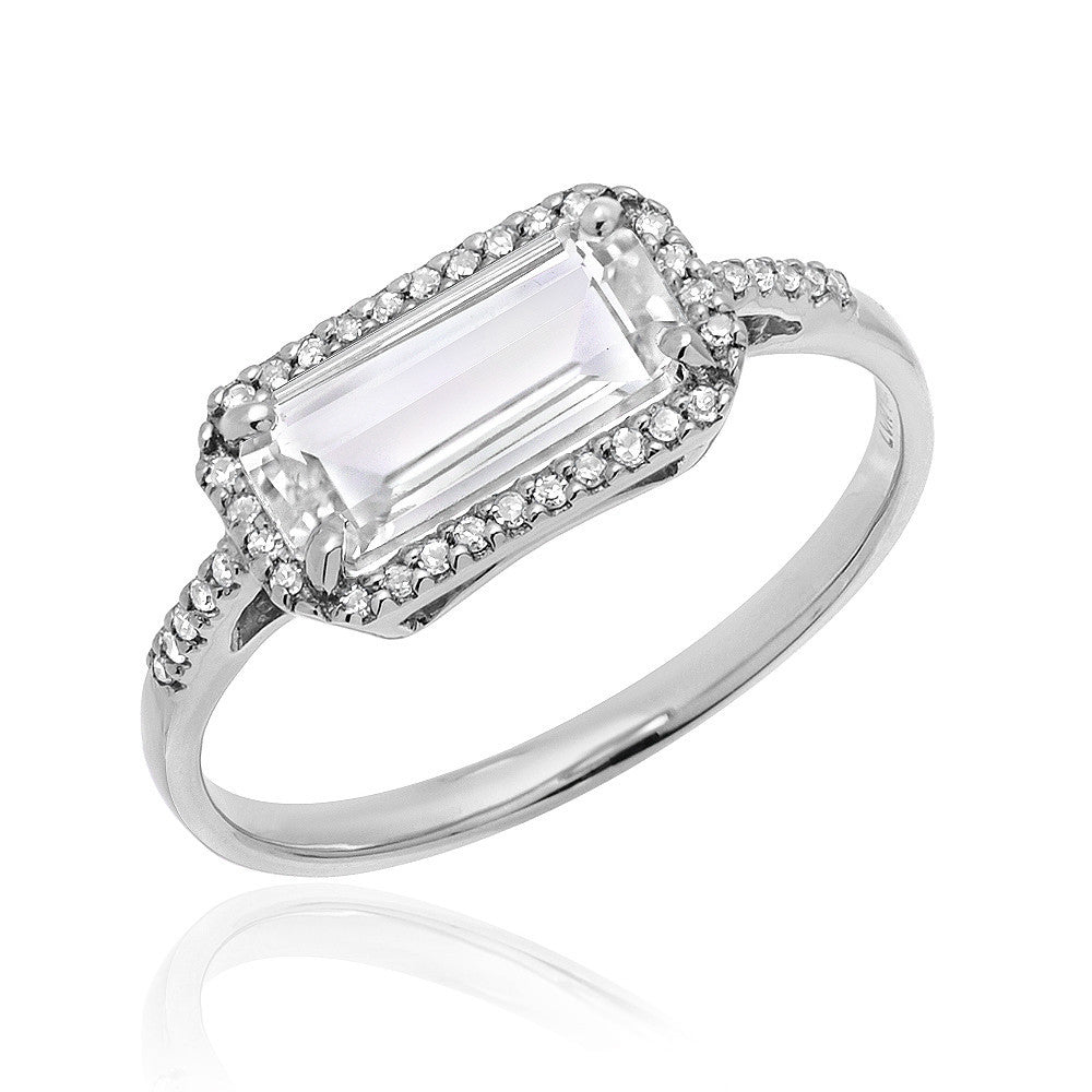 This cute ring is set in 14k gold and features an emerald cut white topaz framed with diamonds on a diamond band. Available in a variety of colored stones.