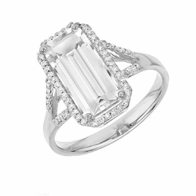This dramatic ring is set in 14k gold and features an emerald cut white topaz framed with diamonds on a split shank diamond band. Available in a variety of colored stones.