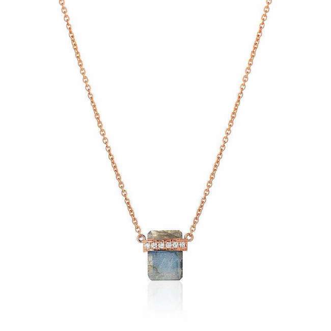 For those who love to make a statement that’s as effortlessly beautiful as it is understated and chic, we’re thrilled to present the Ethos Necklace. Symbolizing protection and strength, this gorgeous necklace features a diamond encrusted band wrapped around a beautifully faceted emerald cut labradorite which makes for an unforgettable visual impression.