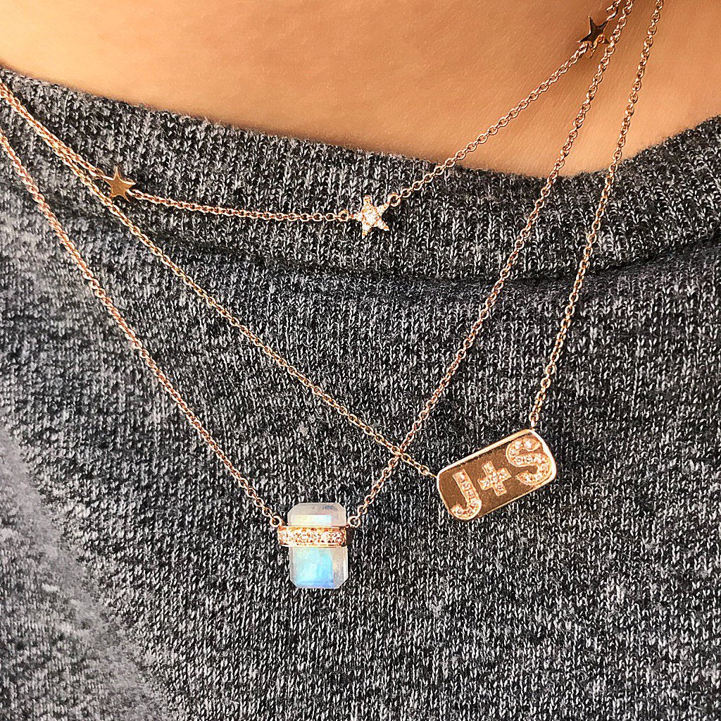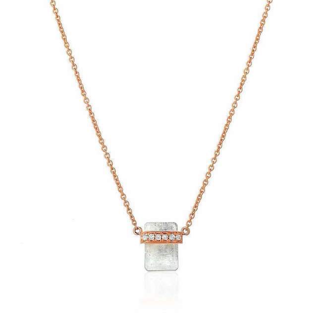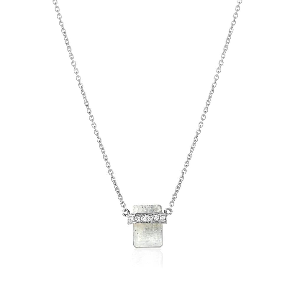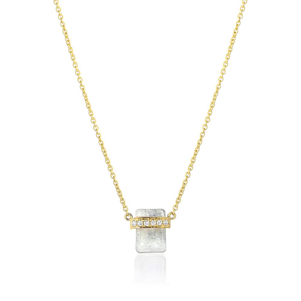 An elegant emerald cut rainbow moonstone is wrapped with 14k gold and diamonds, and hung from a 16-18" adjustable chain.