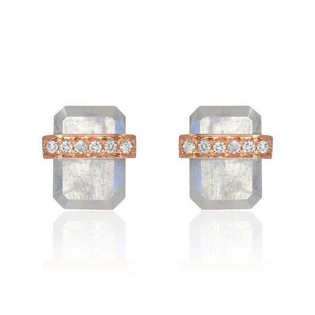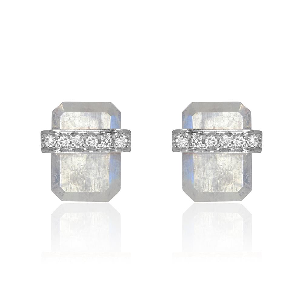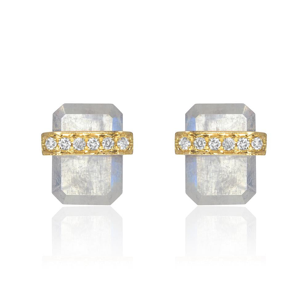Symbolizing protection and strength, our Ethos post earring is set in 14k gold and features a diamond encrusted band wrapped around a pair of beautifully faceted emerald cut rainbow moonstones.
