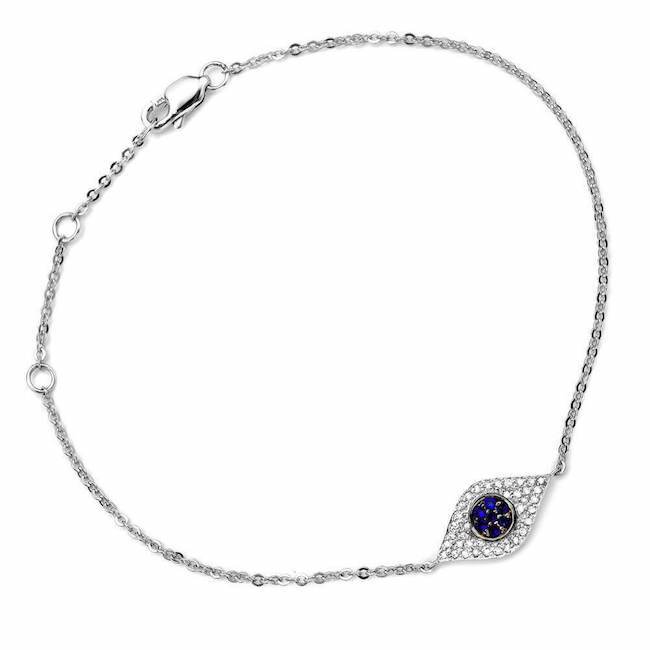 This evil eye bracelet features diamonds and blue sapphires set in 14k gold, on an adjustable 6.0-6.5-7.0" bracelet.