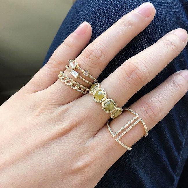 This simple and classic 14K gold band features handset white diamonds halfway around the band, highlighting a baguette diamond. This ring's slender shape make it perfect for stacking.