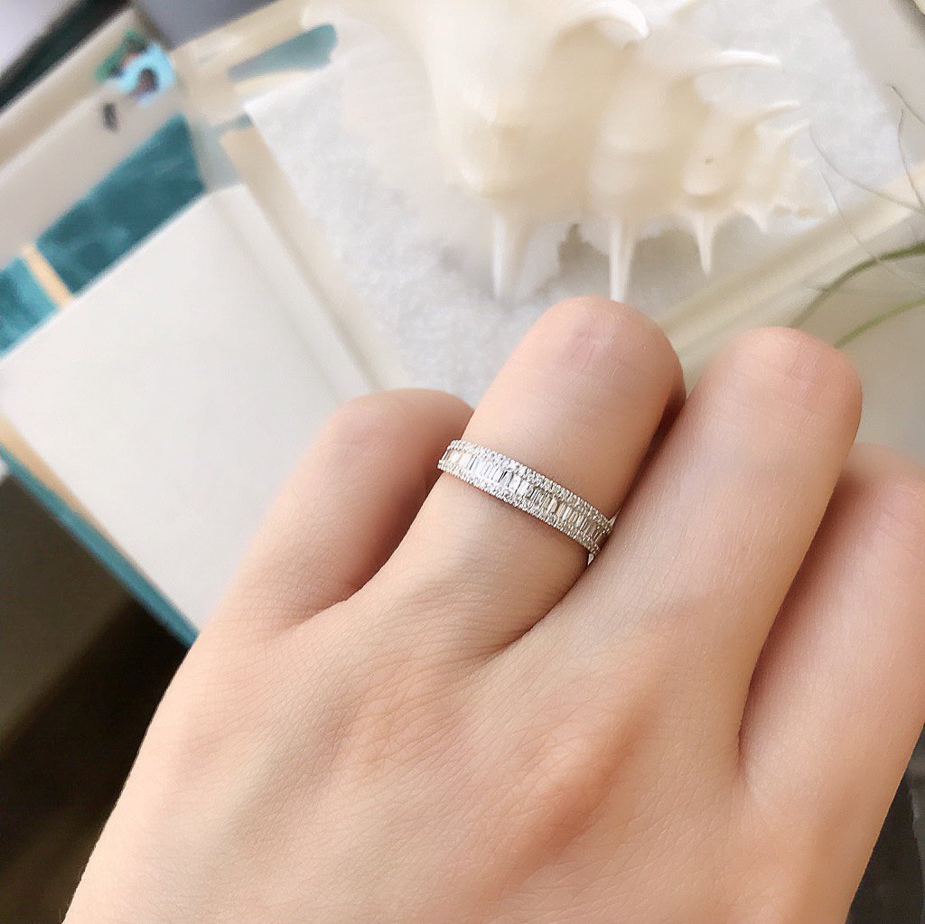 Fact: you deserve to sparkle. Let this stunning heirloom baguette diamond band do the work. Set in 14k gold, this best-selling channel set band has a beautiful diamond border detail that shimmers like a dream. One of our most popular rings, this baguette diamond ring is perfect for the bride who wants to express herself. It's also a favorite of fashion-forward women who just want to add a touch of luxurious sparkle to their look. Stack this ring or wear it solo.