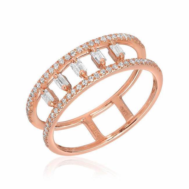 This simple and classic 14K gold band features handset white diamonds halfway around the bands, highlighting baguette diamonds. This ring makes an amazing centerpiece to a stack with our thin diamond bands.