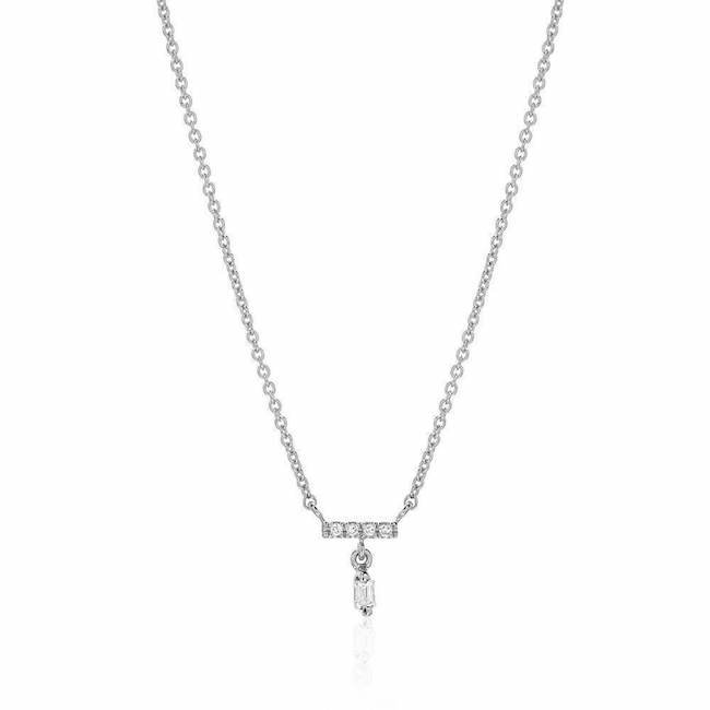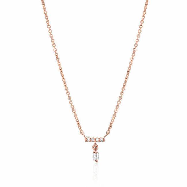 Part of our Heirloom Collection, this 16-18" adjustable 14k gold necklace features a tiny diamond bar with a single dangling baguette diamond.
