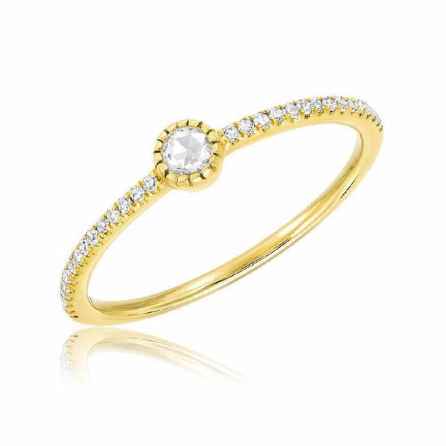 Such a cutie! This 14K gold band has handset diamonds set halfway around and features a rose cut diamond center stone. This sweet ring is the ideal starting point for your Heirloom stack.