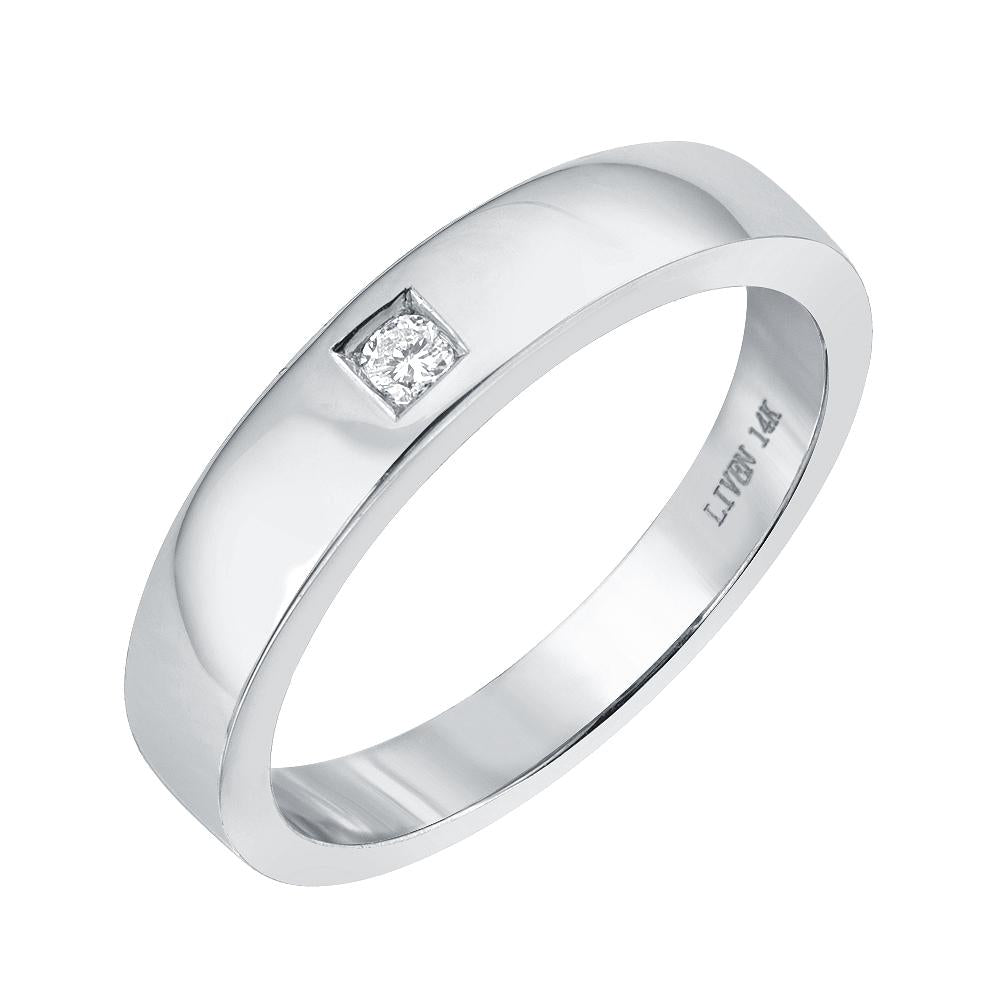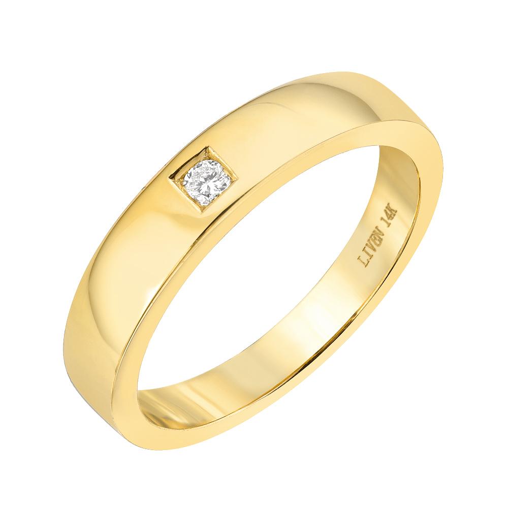 This gorgeous cigar band style ring features a sweet round diamond in a square setting. A modern twist on a classic style, this ring is great for stacking or wearing alone.