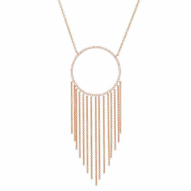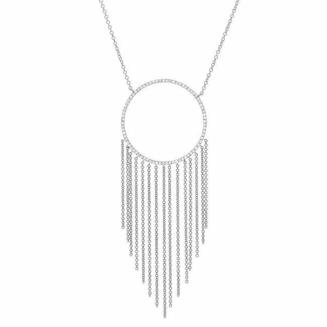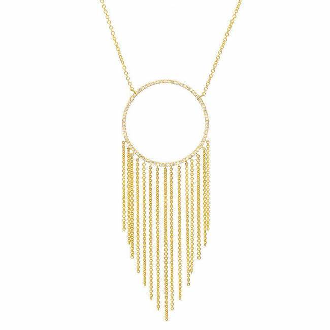 This 14k gold necklace features a striking open circle with diamonds and elegant fringe chain set on a 22-24-26" adjustable chain.