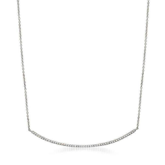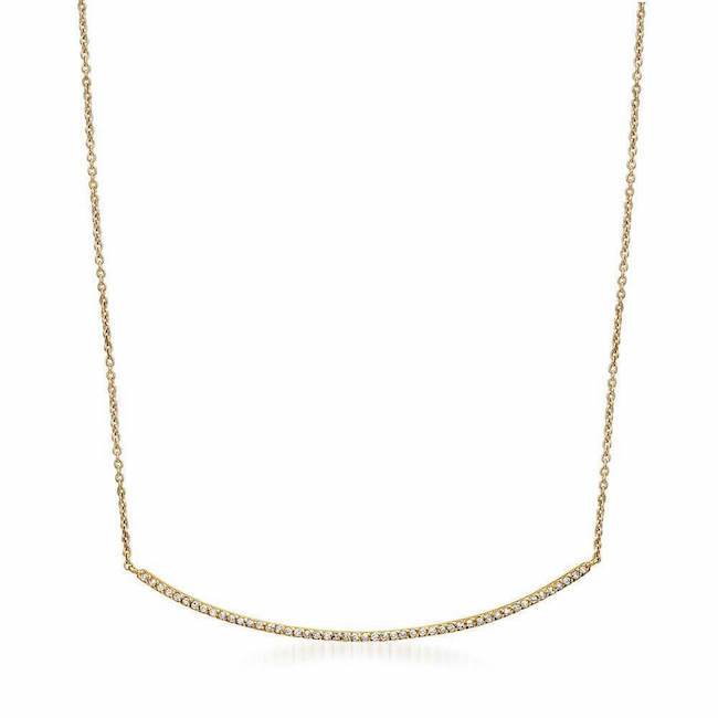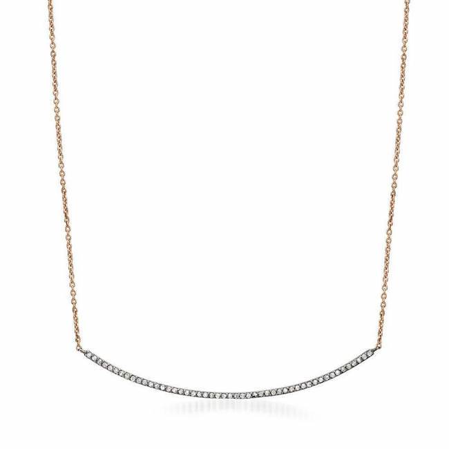 Simply chic! This diamond bar necklace has 49 handset diamonds set in 14K gold with the perfect arch that complements any neckline. Perfect for layering or simply worn alone for a dash of sparkle. Hangs from a 16-18" adjustable chain.
