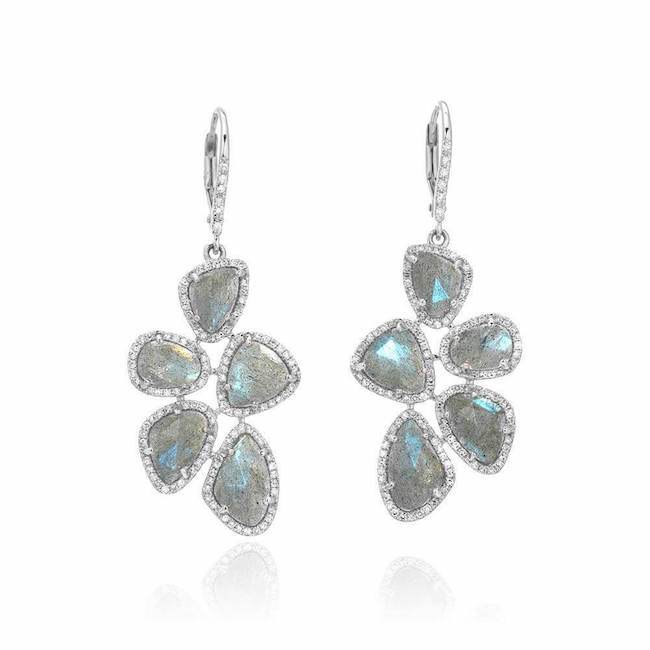These beautiful dangle earrings feature rose cut labradorites haloed with diamonds set in 14k gold.