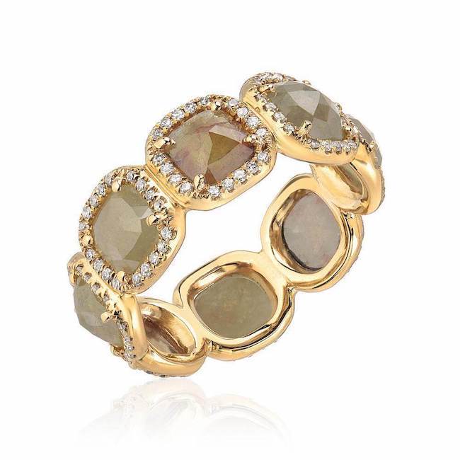 This stunning yellow gold ring features one of a kind rustic diamonds all the way around haloed by hand set white diamonds.