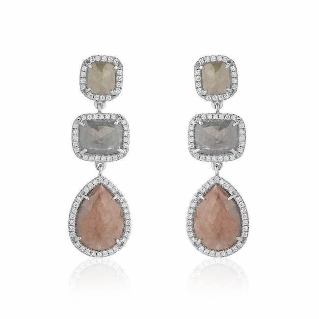 These gorgeous double dangle earrings feature one of a kind rustic diamonds haloed by hand set white diamonds, on a post backing for a sleek look.