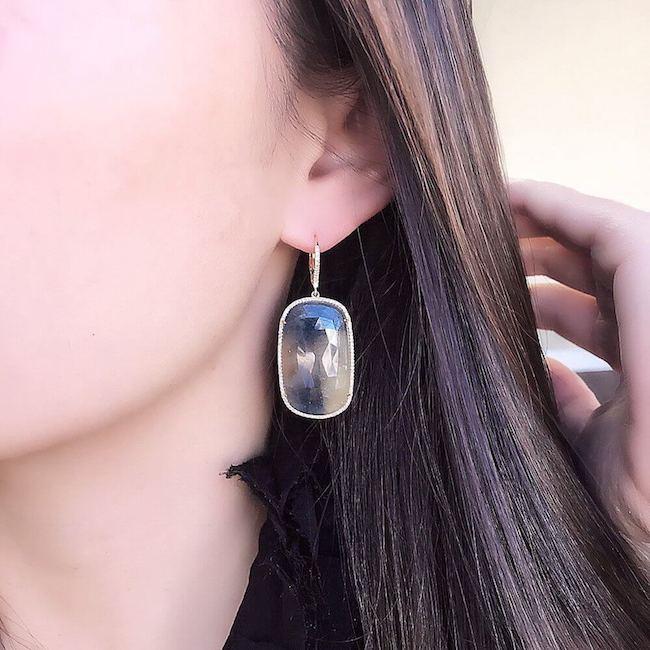 Set in 14k yellow gold, these one of a kind earrings feature a pair of beautiful sapphires surrounded by 197 handset diamonds.