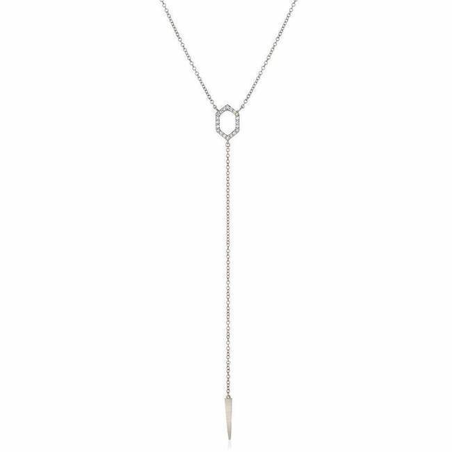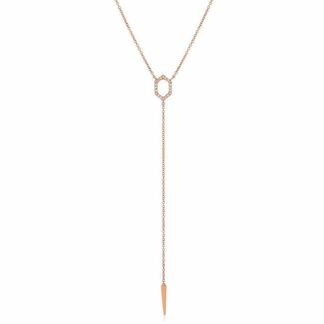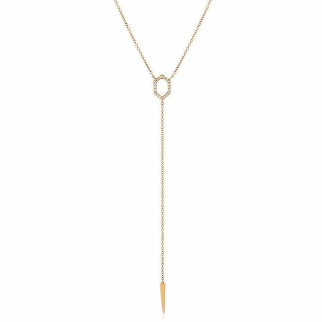 This lariat necklace is set in 14k gold and features 20 hand set diamonds. This necklace is on an 16-18" adjustable chain, with an 3" lariat dangle.