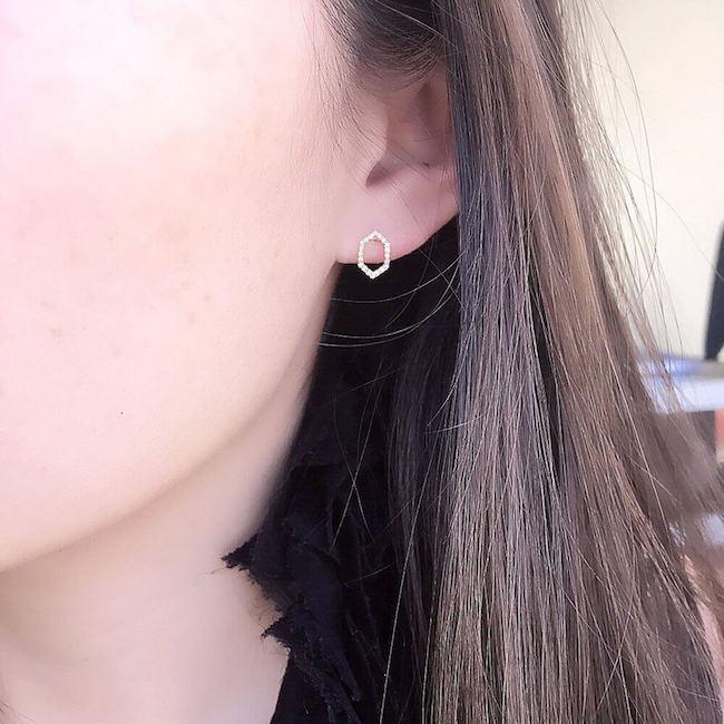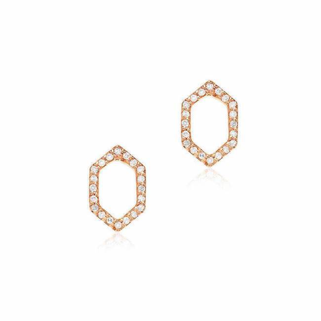 14k gold open hexagon post earrings feature 40 handset diamonds.