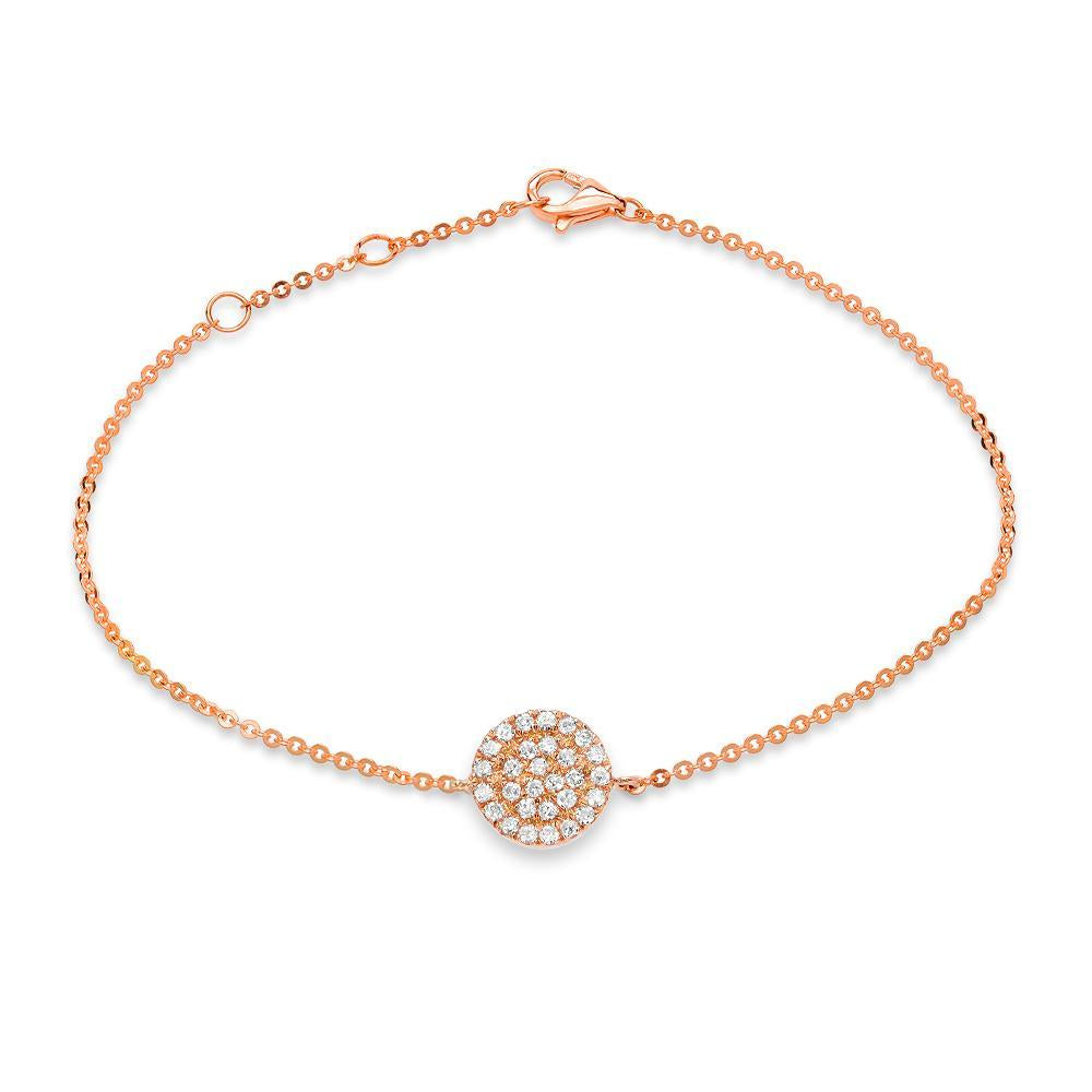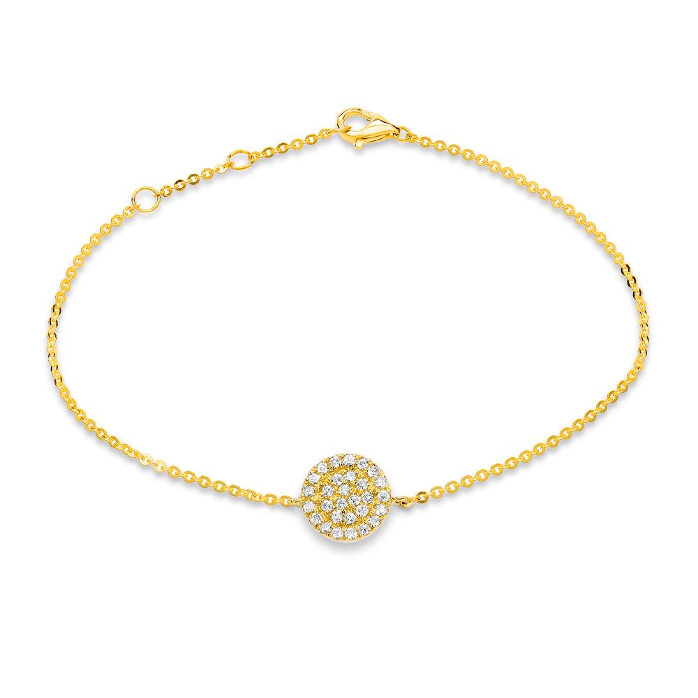 This simple bracelet features handset diamonds set in 14k gold on an adjustable 6.0-6.5-7.0" chain bracelet. Disc is 6.5mm in diameter.