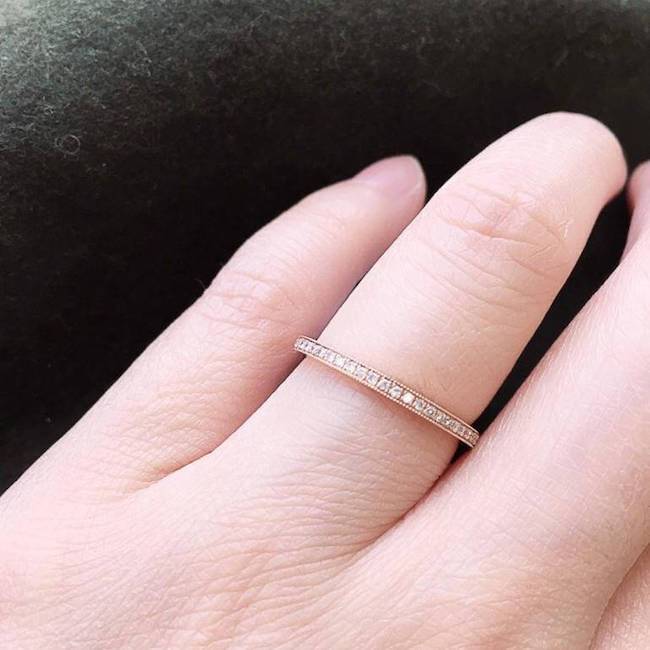 14K gold eternity band with pave set diamonds highlighted with milgrain borders. This beautiful decorative band is a great choice for bridal.