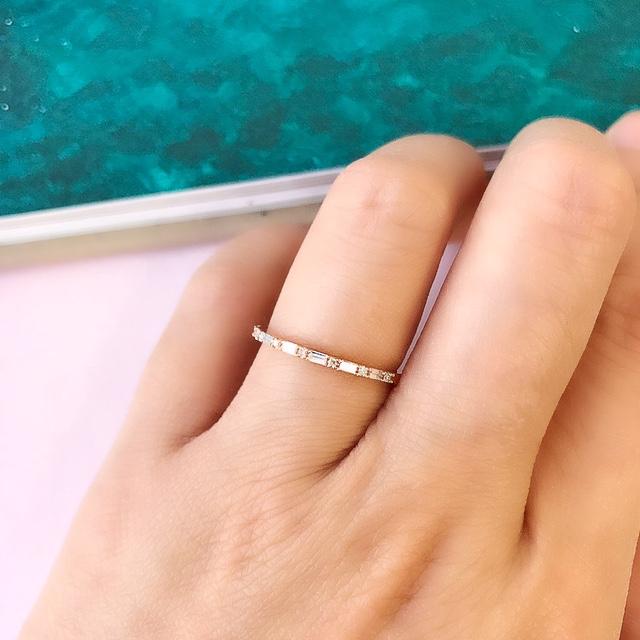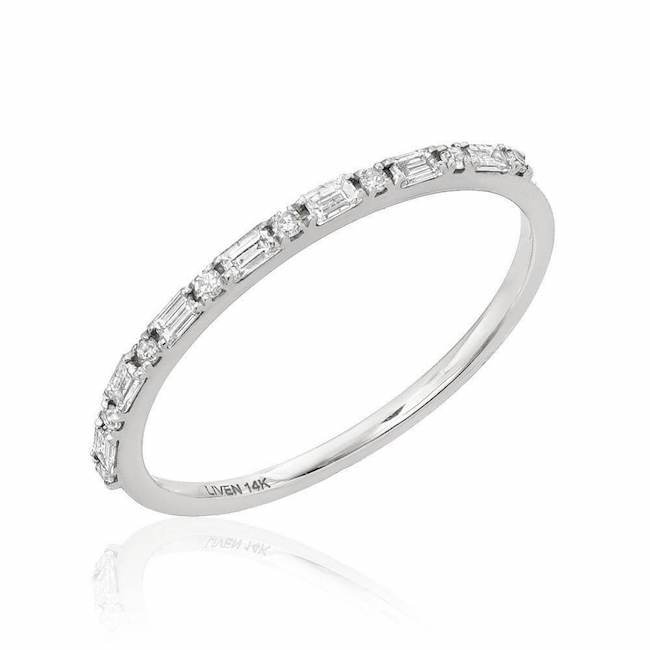 This is the one you’ve been looking for. Our Petite Baguette and Round Diamond Halfway Band features tiny baguette and round diamonds alternating across the front of a delicate 14k gold band, creating incredible sparkle and texture. This petite baguette diamond ring is perfect for starting a stack –– or to give as a truly unique baguette engagement ring, or wedding band for that someone special.