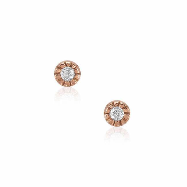 These cute 14k gold earrings feature a petite bezel set diamond with a milgrain border. The perfect pop of style for a cool casual everyday look.