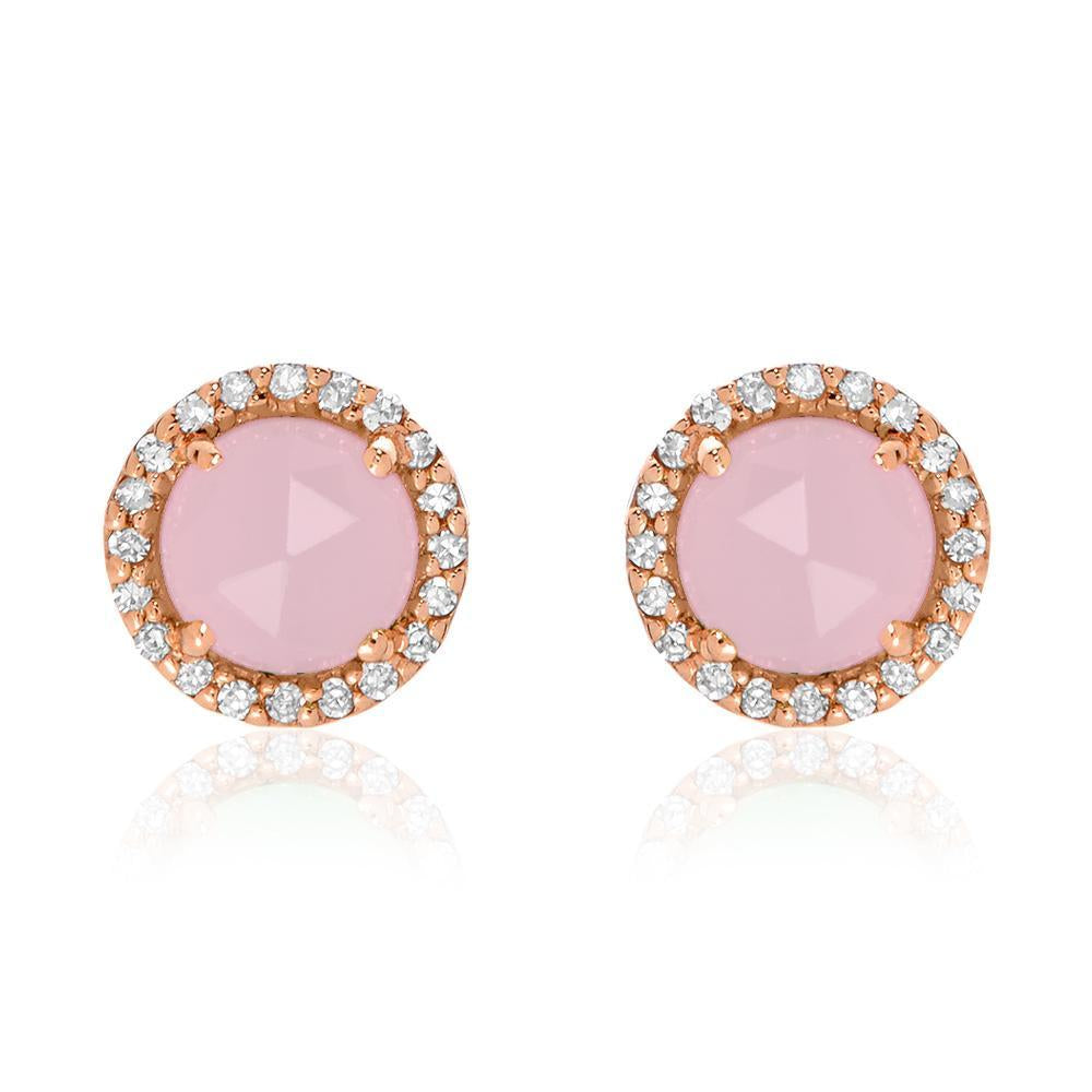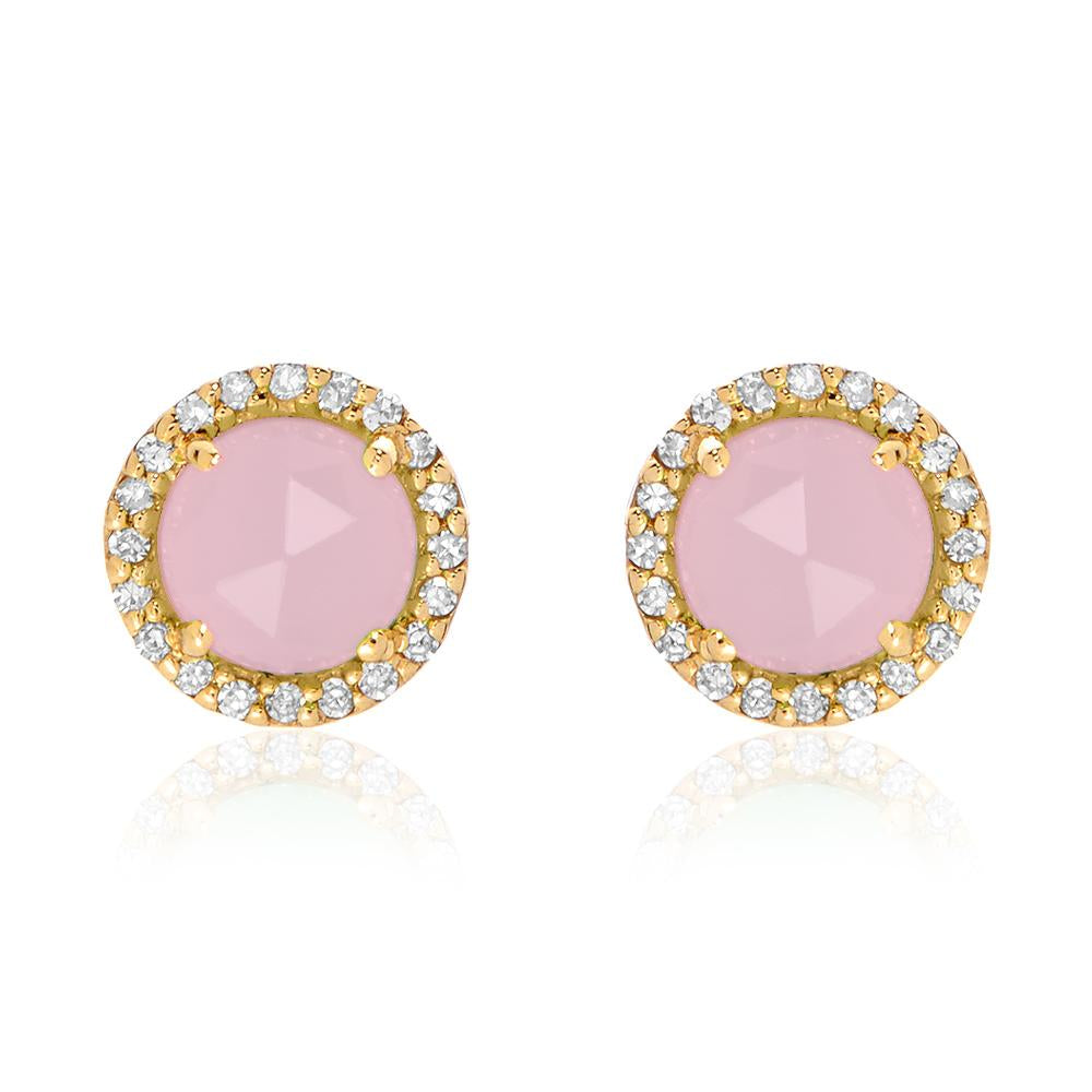 5.0mm stud earrings in 14k gold with a rose cut pink opal center and a halo of diamonds on each stud.