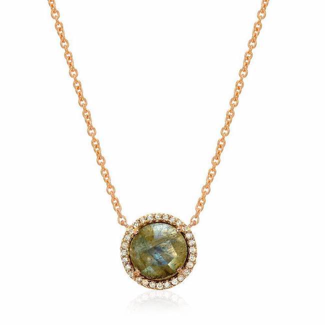 This classic 14k gold necklace features a 7.0mm diameter rose cut labradorite with a diamond halo and is attached to an adjustable 16-18” chain.