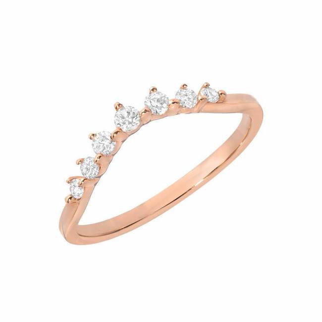This seven stone curve band features seven beautiful graduated diamonds prong set in 14k gold. The gentle arch of this ring is an on-trend variation of a typical diamond and gold stacking ring. We love wearing this seven stone diamond ring to frame a larger statement ring, or on its own to show off its unique shape. This little beauty also makes for a lovely wedding band or an alternative to a traditional engagement ring.