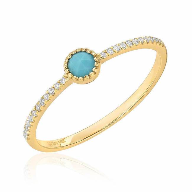 This adorable ring features a rose cut turquoise on a 14k gold band halfway set with diamonds.
