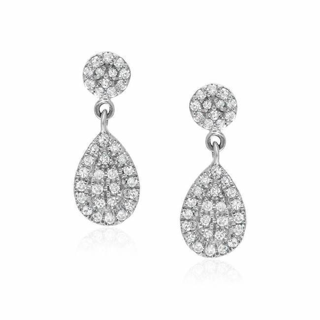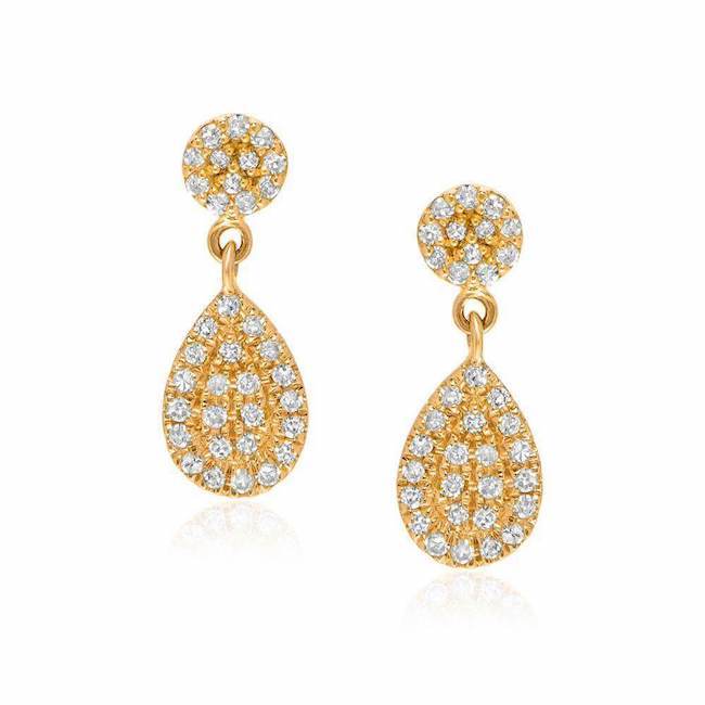 14K gold pave disc earrings, with dangling pave pear shapes to add movement and sparkle.