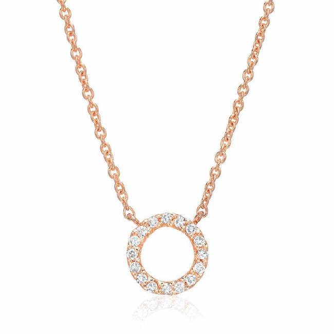 This 14K gold small circle necklace features 16 hand set diamonds, and hangs from a 16-18" adjustable chain.