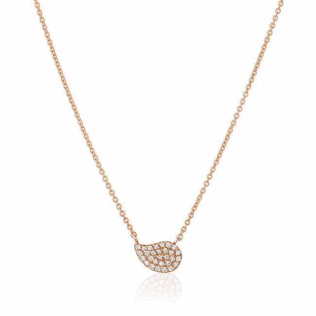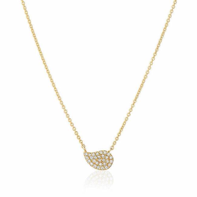 This small pave paisley shape necklace is set in 14k gold and is attached to a 16-18" adjustable chain.