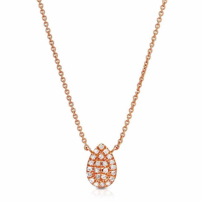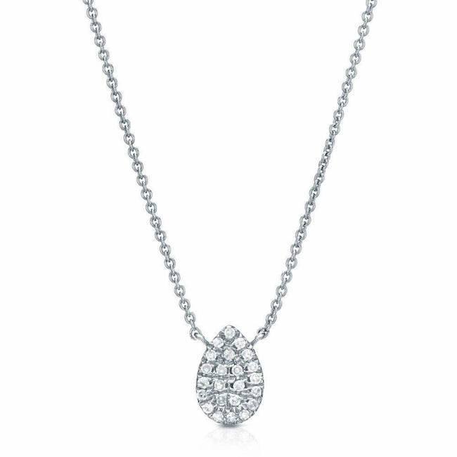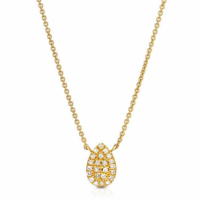 Set in 14k gold, this simple pave pear necklace features hand set diamonds and hangs from a 16-18" adjustable chain.