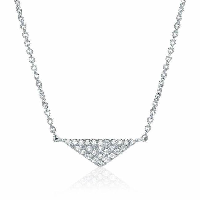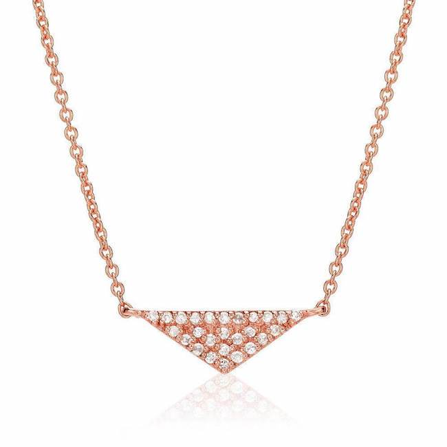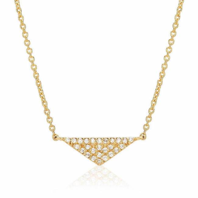 This diamond pave necklace has 26 diamonds encrusted to the edge of the triangle. Perfect for layering or worn alone, fixed to a 15-16" adjustable chain.