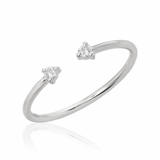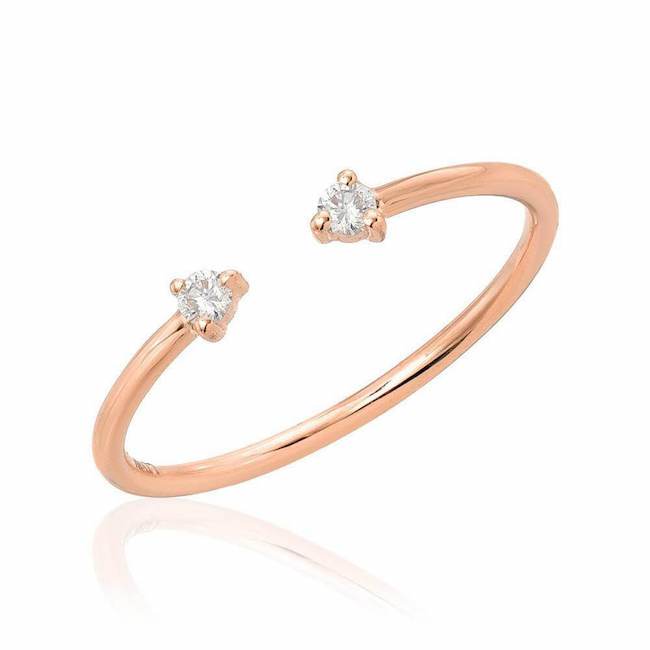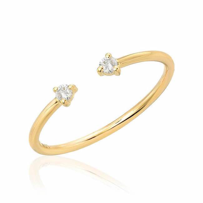 Part of our Souli Collection, this sweet open band diamond ring features two matching prong-set diamonds on each end of the 14k gold band. The unique open shape gives this diamond ring an airy, ethereal feeling, and combines timeless materials with a distinctly modern form. Stack this beauty with other gold and diamond rings, or wear on its own to add a subtle hint of elegance to any outfit.