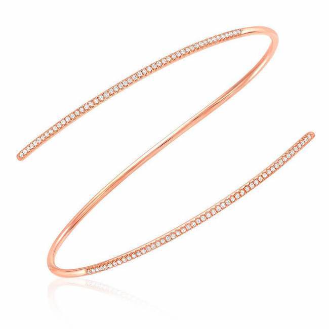 Turn heads with this gorgeous Spiral Cuff bracelet. This 14K gold diamond cuff bracelet features a shimmering spiral of hand-set diamonds in your choice of white, yellow, or rose gold. With a unique, eye-catching shape you can add a simple twist of luxury to your jewelry collection that is sure to set off any outfit. However you choose to wear it, this remarkable piece is destined to become a fave.