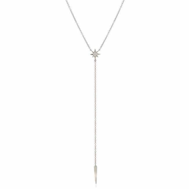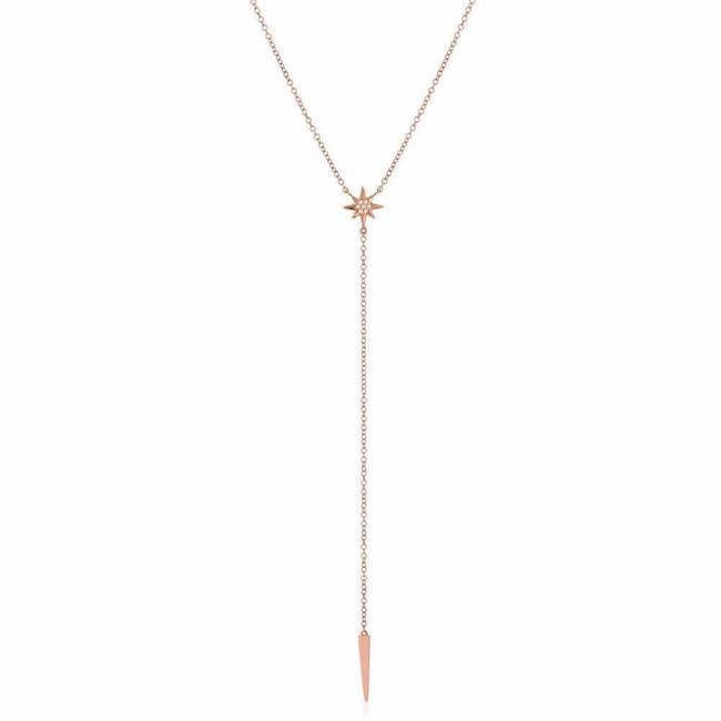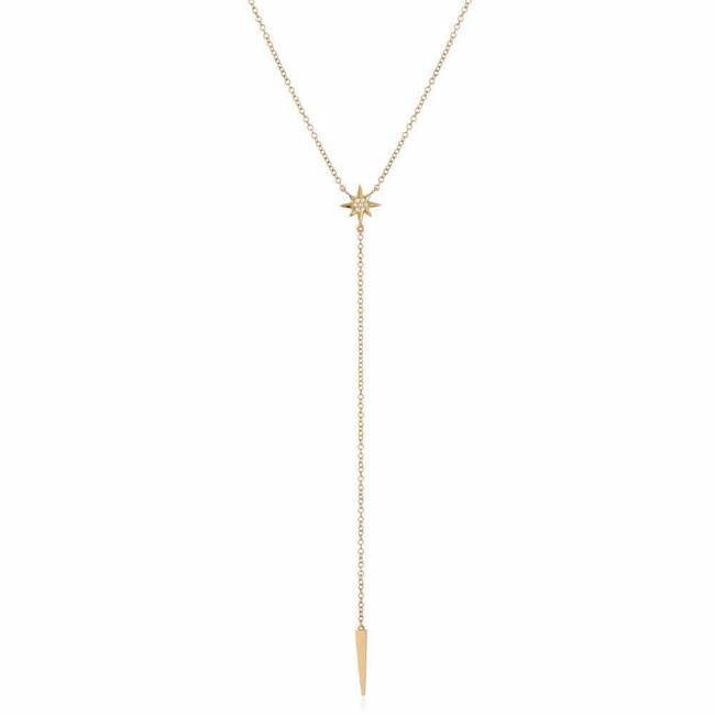 This lariat necklace is set in 14k gold and features 7 hand set diamonds. This necklace is on an 16-18" adjustable chain, with a 3" lariat dangle.