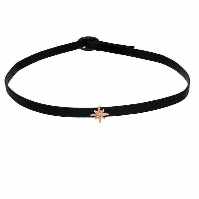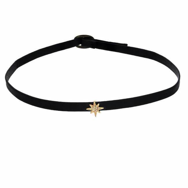 A Liven classic reimagined! This 14k gold starburst is set with diamonds, and is threaded onto a 6mm wide choker made of soft, luxurious leather in your choice of 5 colors. This choker closes at the back with a black zinc buckle. Choose to wear as a choker, or as a stylish wrap bracelet.