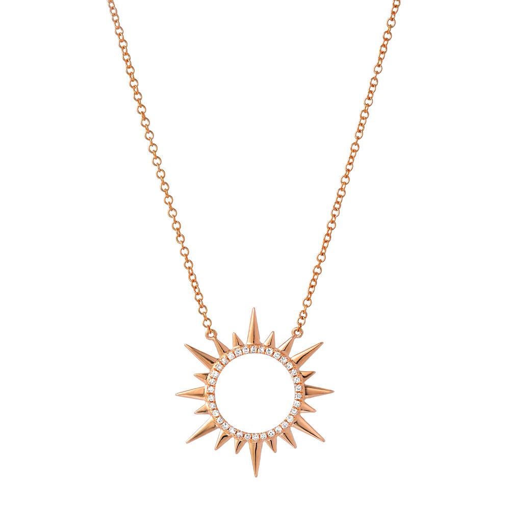 This simple, elegant necklace is perfect for layering. An open circle of diamonds is surrounded by high polish rays. A modern, chic piece.