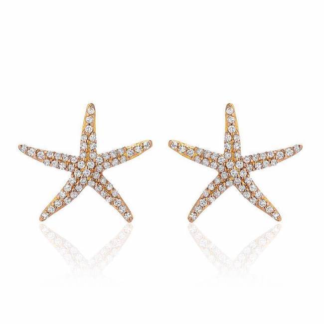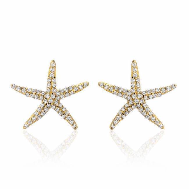 These 14k gold starfish earrings are studded with diamonds.