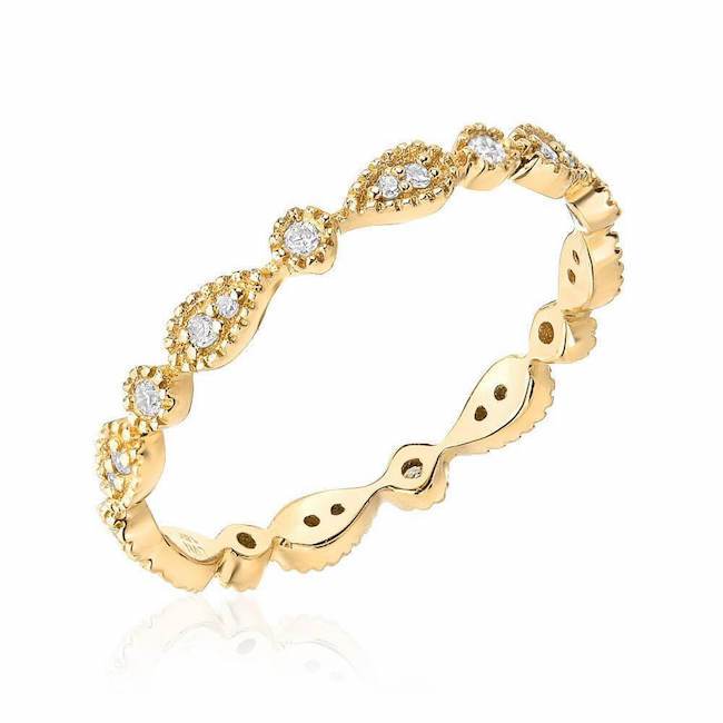 This pretty eternity band features diamond studded pear and round shapes with milgrain details set in 14k gold. Perfect for stacking, or for wearing alone.