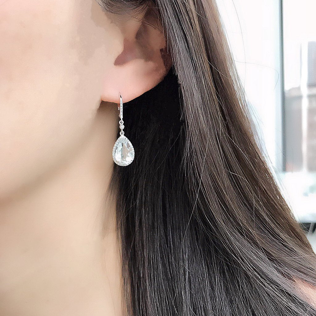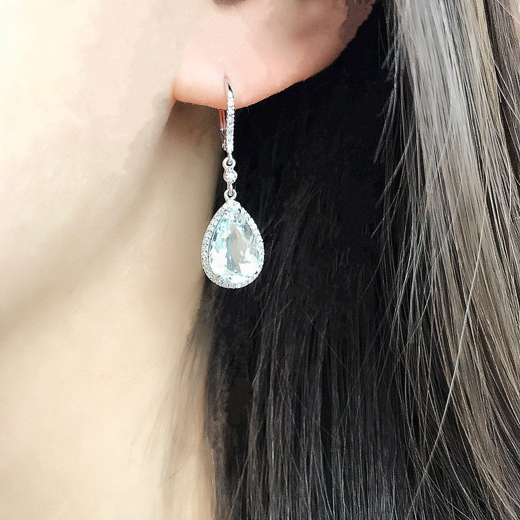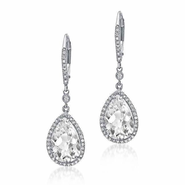 These stunning 14k gold earrings feature two faceted white topaz stones lined with diamonds and accented with two bezel set diamonds.