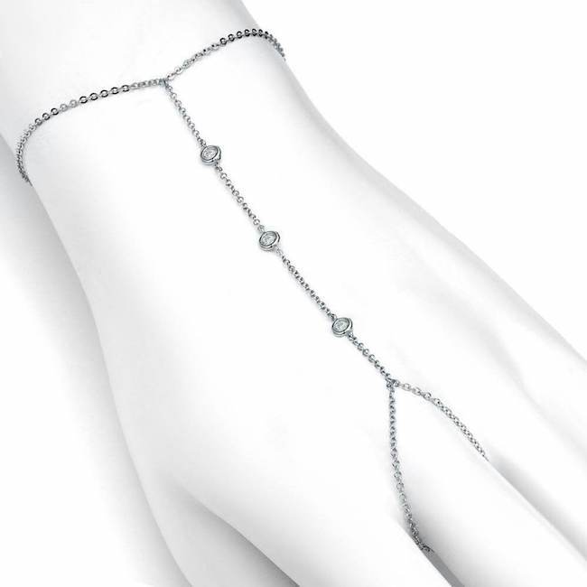 This three diamond hand chain features 3 brilliant diamonds set in 14K gold and is attached to an adjustable 6-6.5-7” chain bracelet.